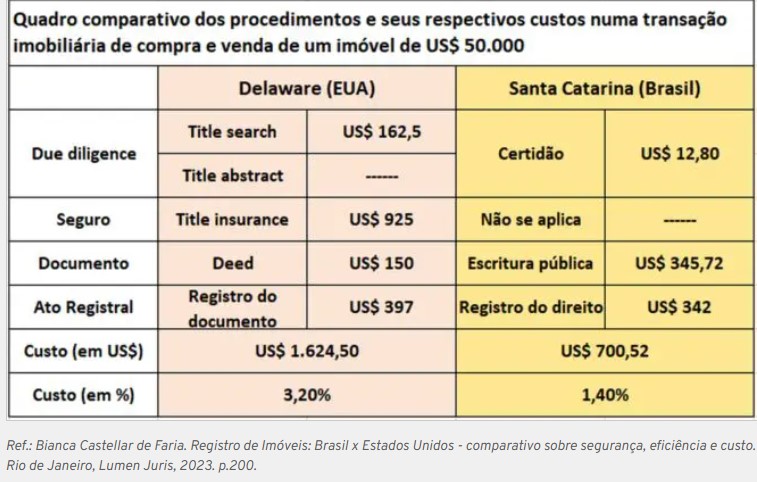 Em outra comparação, Bianca Castellar de Faria verificou que os custos de procedimentos relacionados a uma transação de compra e venda de imóvel nos EUA, no valor de US$ 50 mil (cerca de R$ 266 mil, pelo câmbio oficial), é mais que o dobro do Brasil.